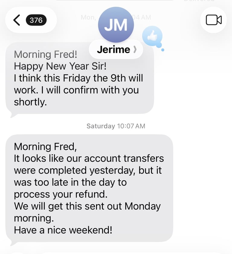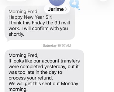 Jerime Monroe texted me the following message on Saturday, January 10, 2026, at 10:07 AM PT. He states in writing he will have my $125k to me Monday morning and blames account transfer delays.