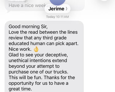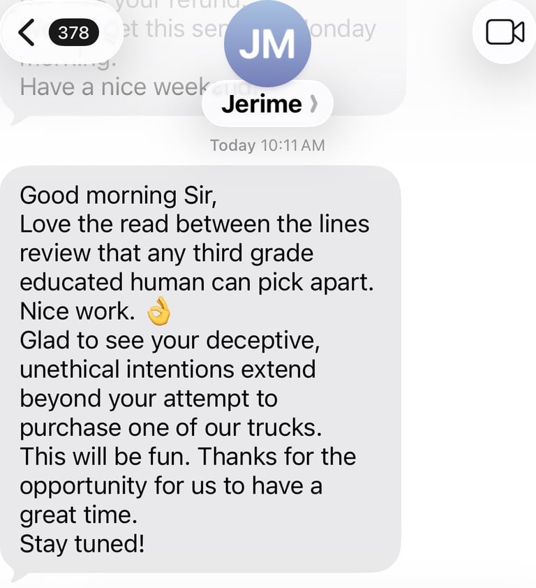 Jerime also declined to allow me to cancel my order. In fact, he questioned whether I was having financial distress and if that was my real motivation for wanting to cancel vs just catching his "President of Delivering Bad Ass Trucks" trying to take advantage of me.