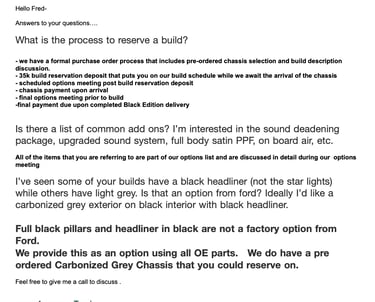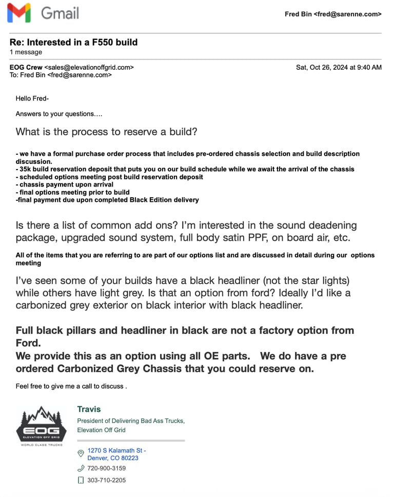 Travis initially sent me a one pager on their builds and then ghosted me - he literally wouldn't respond to my emails. But I wanted the truck badly, so I called their office a bunch of times.