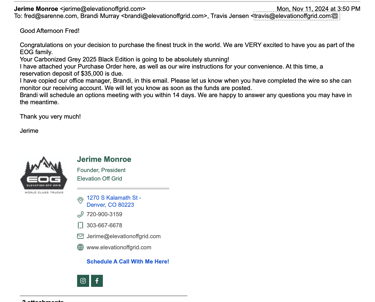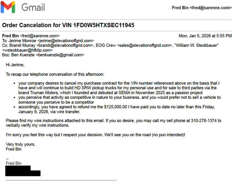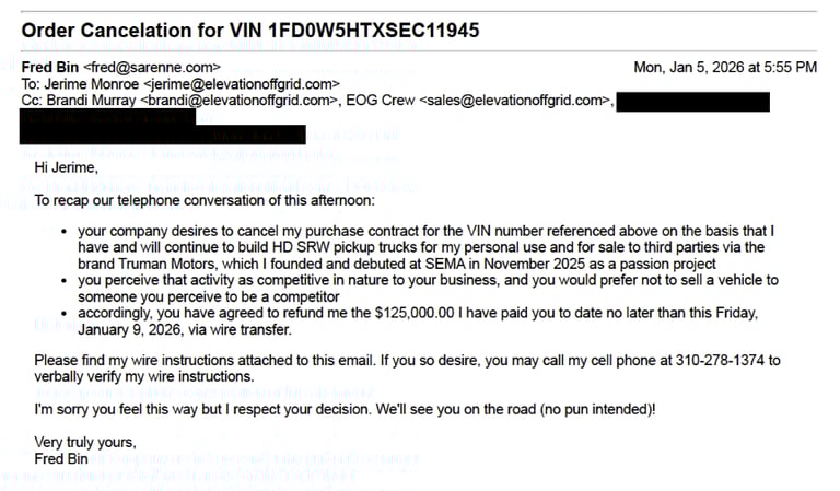 On January 5, 2026, after I still hadn't received my truck that was supposed to be delivered 6+ months earlier, Jerime Monroe, EOG's principal, called to advise me that he was unilaterally cancelling my order and refusing to deliver a truck to me because he learned I had built some trucks on my own and I was therefore a competitor.