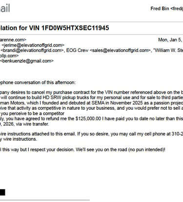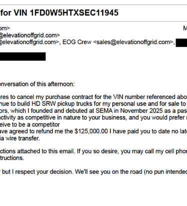 First, I tried to cancel my order in July 2025 in writing after a string of broken promises, abhorrent customer service, and their "President of Delivering Bad Ass Trucks" lying to my face as he tried to charge me $45k for two more inches of rubber. At that time, EOG refused to allow me to cancel my order.