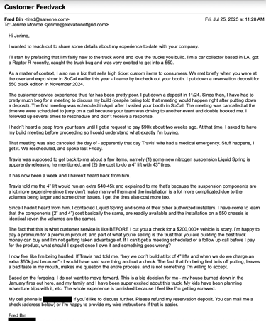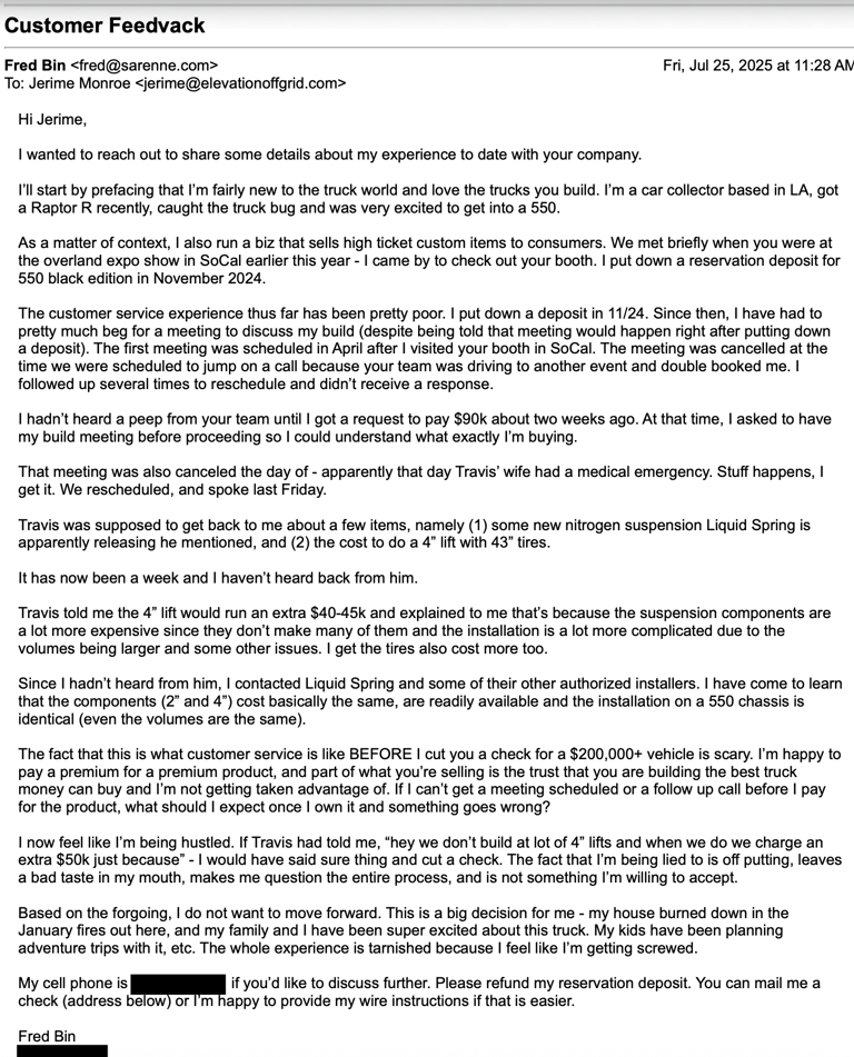 Here's the TL;DR: I paid Elevation Off Grid $125k starting in 2024 for a truck that was to be delivered no later than June 2025. First they ghosted me, then they delayed my delivery 5 months, later they missed subsequent deadlines, and finally they refused to deliver my truck at all or refund the $125k I paid them. Yes, you read that right.