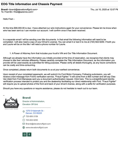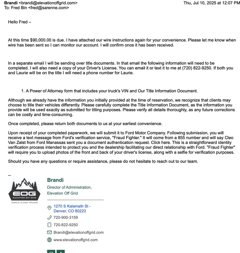 On July 10, 2025, I unexpectedly received an email from Brandi, who is the office administrator at EOG, casually requesting $90k. To Brandi's defense, she is perhaps the most professional and honest person who works at EOG. I wish her well..