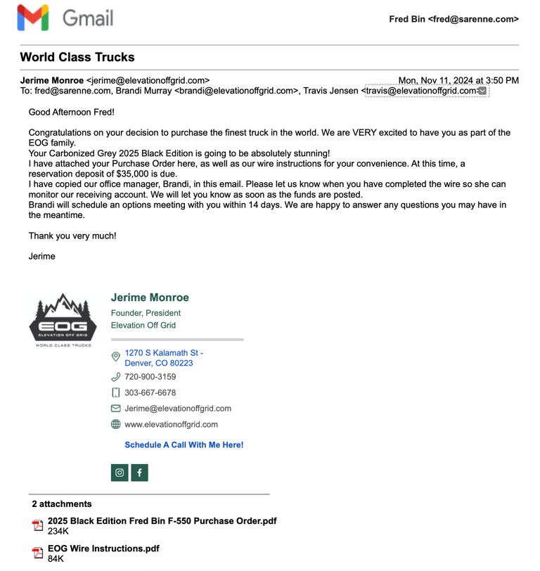 Jerime Monroe, the Founder and President of EOG, sent me an email on November 11, 2024, to request a wire payment of $35k.